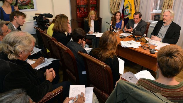 • Wikileaks founder Julian Assagne hopes to leave the London embassy in Equador “soon.” He has had to call the embassy home for two years to avoid being extradited to Sweden to face rape rand sexual assault charges against him. During a press conference he acknowledged “his health had suffered during his time inside the embassy.” [BBC]