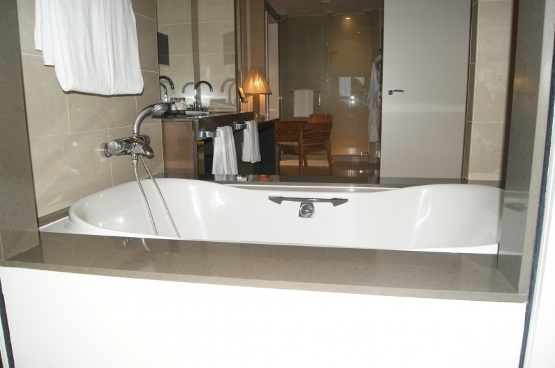 The bathroom has a sliding door that allows you to go from a luxurious soak and jump right into bed or just soak in the tub and watch tv.