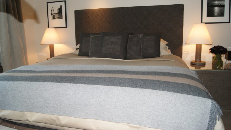 Walking into the bedroom you are greeted by the clear view overlooking the city into Lake Michigan, then your eyes land on the gorgeous bed decorated with Bottega Veneta pillows(again the details are exquisite) the headboard alone makes you want to lay in the bed all day. The intricacy and detailed pattern of the headboard alone will spur a lot of DIY-ers trying to replicate this, its so gorgeous.