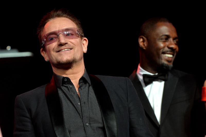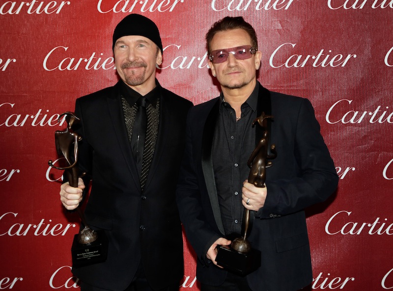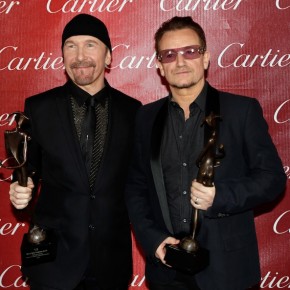 U2’s Bono and were on hand to receive the Sonny Bono Visionary Award for their song ‘Ordinary Love’ from the film Mandela: Long Walk To Freedom which was presented to them by former senator and the late Sonny Bono’s widow Mary Bono and the film’s stars Idris Elba and Naomie Harris.