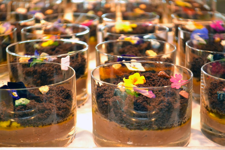 Dinner catered by Sodexo in the aquarium’s galleries, Caribbean Reef rotunda and Kovler Family Hall and playing on the exhibit’s theme, guests were served Kona coffee-rubbed tenderloin medallions, a coconut-ginger crab cake with Polynesian sweet potatoes and tricolor carrots with toasted macadamia nuts. Dessert was an edible terrarium of “dirt” mousse, edible flowers, chocolate rocks, hand painted chocolate frogs and raspberry infused chocolate twigs.