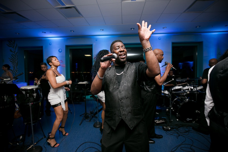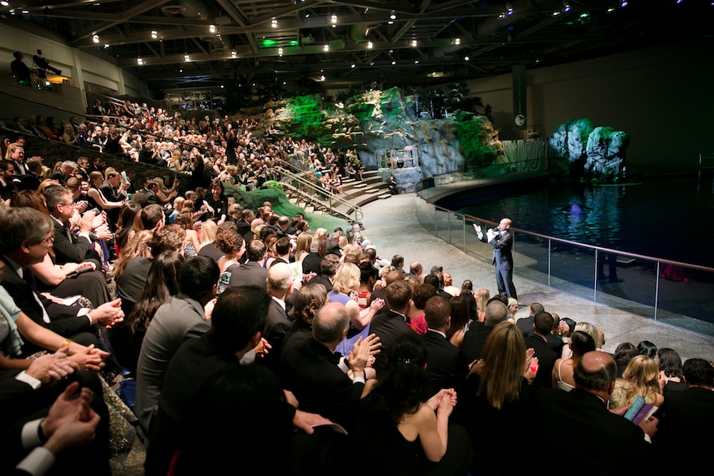 Guests began the evening with cocktails, nosh and encounters with the sea lions, beluga whales, penguins, as well up-close view of the new exhibit. As Shedd stands out in the crowd of Chicago galas vying for those much needed private donations, they went a different route when it came time for the paddle raise portion of their program. Instead of waiting until the end of the evening once guests were well libated and satiated, the paddle raise commitments commenced right after the brief cocktail reception and aquatic show emceed by Bill Kurtis featuring local Chicago band, Cowboy Jukebox. They performed along to a “Rainbow Connection” of sea lions, beluga whales, Pacific-white sided dolphins and rescue animals including dogs, owls and red-tailed hawk, and a special “Jerimiah was a Bullfrog” penguin parade with rockhopper and magellanic penguins. A video montage of all that the Shedd does when it comes to conservation, animal rescue and rehab was played. And the paddle raise began all the way down until $280,000 was raised going towards Shedd Aquarium’s global initiative.