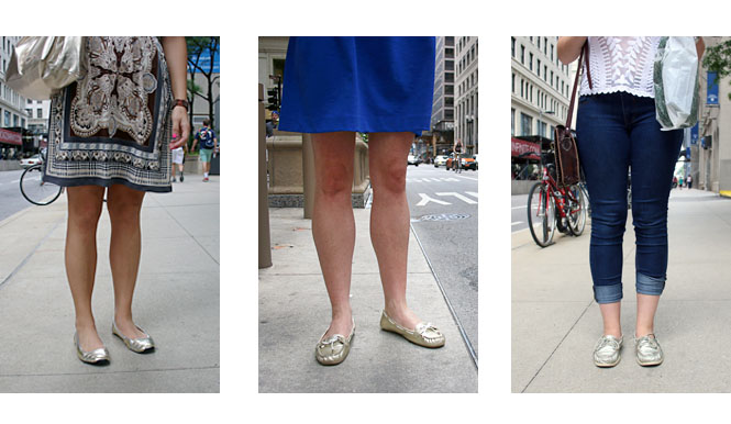 From left to right: Jessica Buie, 23, carries a Donna Karan Gold Metallic Cosmetics Tote with Rocket Dog Silver Loafers // Colleen Tully, 30, wears Anna Klein Sport Loafers // Lauren Polito, 17, wears Sperry Silver Loafers